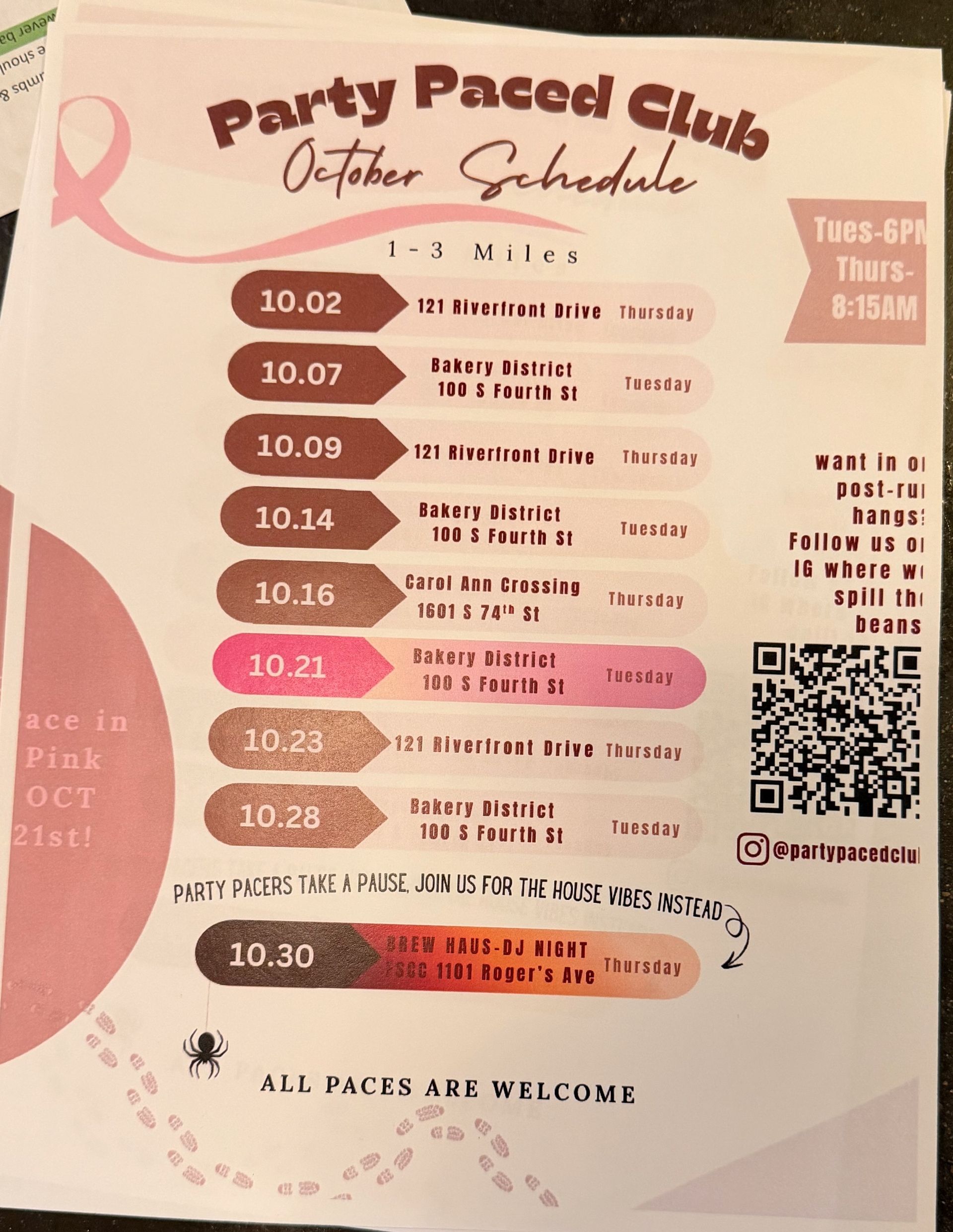The schedule: 🗓️ Tuesdays 6PM & Thursdays 8:15AM throughout October 📍 Multiple locations (see full schedule below) 💰 Free, all fitness levels 📱 Follow @partypacedclub for weekly route updates