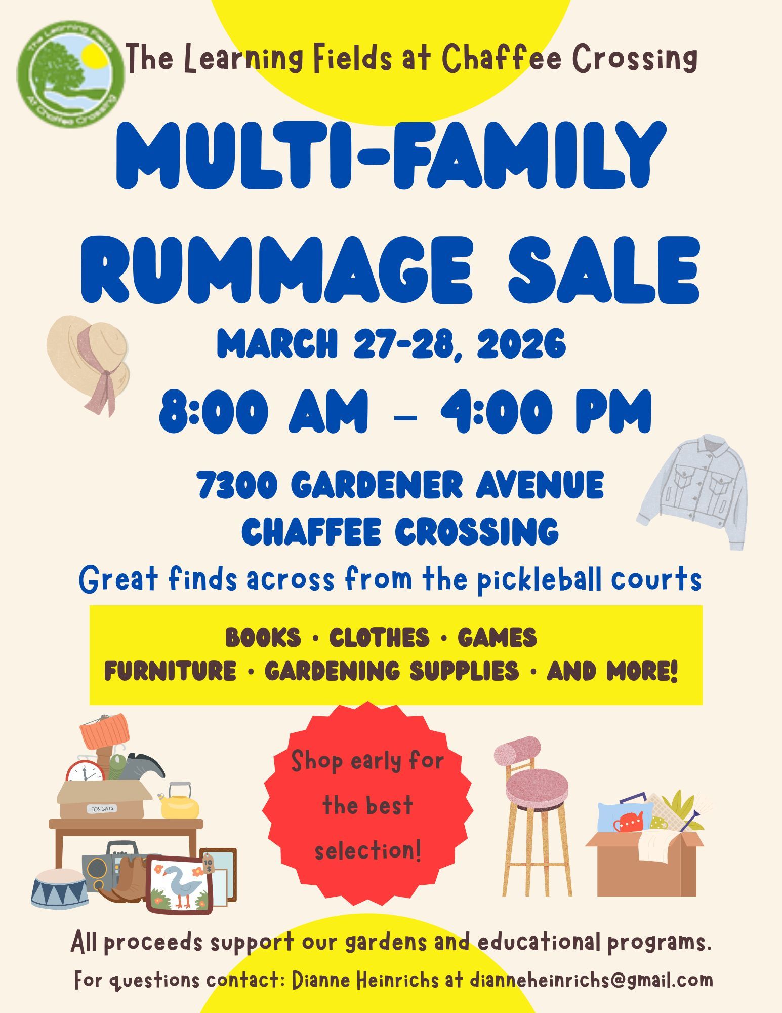 What's happening: The Learning Fields at Chaffee Crossing is hosting a two-day multi-family rummage sale this weekend. The Learning Fields is a volunteer-maintained nonprofit home to more than 28 demonstration gardens, with programs spanning gardening, beautification, environmental stewardship, and lifelong learning. Proceeds go directly to supporting those gardens and educational programming.